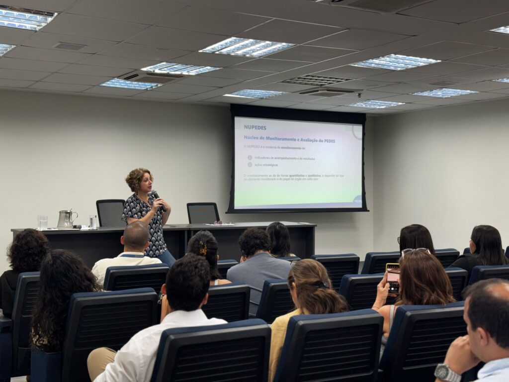 Os superintendentes Marcos Dominguez e Luciana Ferreira, além da coordenadora Desirée Rosalino foram os responsáveis pelas apresentações, que visaram detalhar as atribuições dos órgãos setoriais e de seus representantes no NUPEDES. Na ocasião, os participantes tiveram a oportunidade de esclarecer dúvidas e contribuir com sugestões para o aprimoramento da governança do PEDES a fim de garantir que cada setor contribua de forma efetiva para o monitoramento e avaliação das diretrizes estabelecidas no Plano Estratégico.