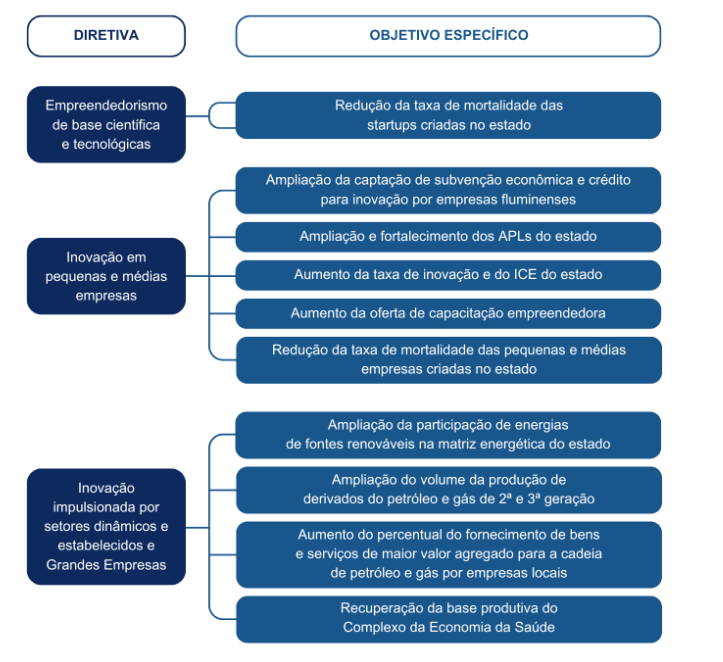 Três estratégias orientam essa missão: a promoção da inovação impulsionada por setores dinâmicos e estabelecidos e grandes empresas – sobretudo dos setores de Petróleo e Gás, da Economia da Saúde e da Economia Verde; a difusão da inovação em pequenas e médias empresas, principalmente por meio da transferência de tecnologia de instituições científico-tecnológicas para o setor produtivo; e o estímulo ao empreendedorismo de base científica e tecnológica, modalidade que possui alto grau de inovação e potencial de geração de empregos altamente qualificados.
