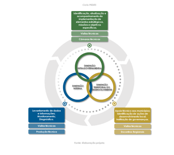 O ciclo do PEDES é composto por três dimensões de trabalho que abarcam as principais atividades e produtos gerados a partir da implementação e monitoramento do instrumento. Essas dimensões, que se retroalimentam constantemente, não possuem nem um caráter sequencial e nem são estanques, havendo uma série de intersecções entre elas. Dessa forma, as formas de atuação de cada uma delas possuem especificidades próprias, mas podem ocorrer de maneira simultânea.
