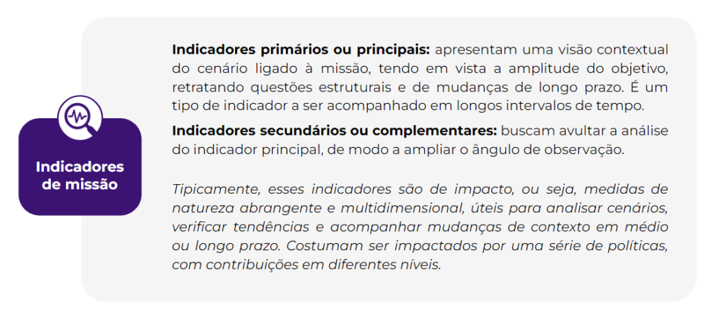 Indicador de acompanhamento: mensura o resultado de ações ou entregas de terceiros; o impacto de ações de múltiplos entes, ou retrata a conjuntura geral.