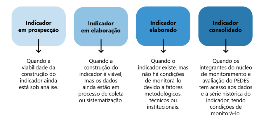 Finalmente, os indicadores do PEDES podem ser classificados em relação à sua maturidade: indicadores em prospecção, em elaboração, elaborados e consolidados.